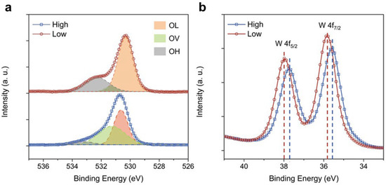 (a) O 1s core-level XPS spectra, (b) W 4f core–level XPS spectra of the high and low samples. Reproduced with permission [38]. Copyright: 2022, Wiley–VCH.