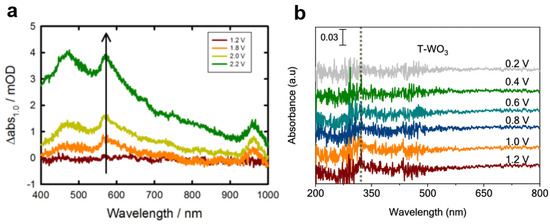(a) Change in absorption spectra measured at different potentials under 0.1 mW cm−2 405 nm illumination. Reproduced with permission [108]. Copyright: 2014, American Chemical Society. (b) In situ ultraviolet–visible spectroscopy of T–WO3 photoanodes under illumination in 0.1 M NaClO4. Reproduced with permission [109]. Copyright: 2023, American Chemical Society.