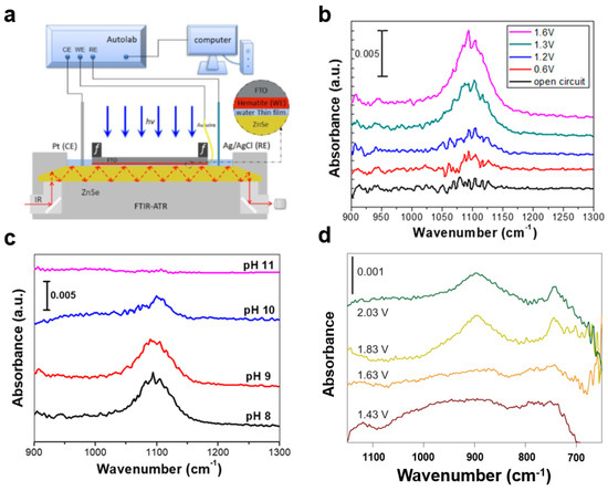 (a) Schematic diagram of PEC FTIR–ATR apparatus. (b) FTIR spectra on the hematite photoanode under AM 1.5 G illumination in unbuffered pH 8 electrolyte (0.5 M NaClO4) with applied potentials from 0.6 VRHE to 1.6 VRHE (c) FTIR spectra recorded on the hematite photoanode with applied potential of 1.6 VRHE at different pHs. Reproduced with permission [81]. Copyright: 2018, American Chemical Society. (d) Infrared spectra of hematite scanned at constant applied potentials, from 1.43 to 2.03 VRHE, in the dark. Reproduced with permission [110]. Copyright: 2016, Nature Publishing Group.