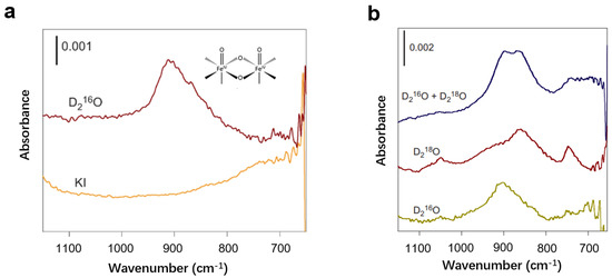 Ultraviolet–visible spectroscopy is a valuable tool for analyzing oxygen-containing species on the surface of metal oxide photoanodes. By examining the position and shape of absorption peaks in UV–vis spectra, the chemical bonds and functional groups present in the sample can be probed, providing insights into the molecular structure. In order to capture intermediate oxygen species, in situ UV–vis spectroscopy is often performed under reaction conditions. For example, Hamann detected Fe=O surface state species through in situ ultraviolet–visible spectroscopy testing [108]. As the potential exceeds the onset potential of water oxidation at the Fe2O3 photoanode, the peak area of the ultraviolet absorption peak corresponding to Fe=O surface state species increases gradually (Figure 12a). This surface state was subsequently identified as an intermediate in the water oxidation reaction, highlighting its role in the process. Similarly, Cui employed in situ ultraviolet–visible spectroscopy to detect peroxide species in secondary calcined WO3 photoanodes [109] (Figure 12b). The presence of peroxygen species was found to enhance the occurrence of the oxygen generation reaction, resulting in a higher oxygen generation Faradaic efficiency after the secondary calcination of WO3. In contrast, tungsten oxide without secondary calcination did not form peroxide species and tended to generate hydroxyl radicals, which were less conducive to oxygen generation. As a result, it exhibited a lower oxygen generation Faradaic efficiency and stability.