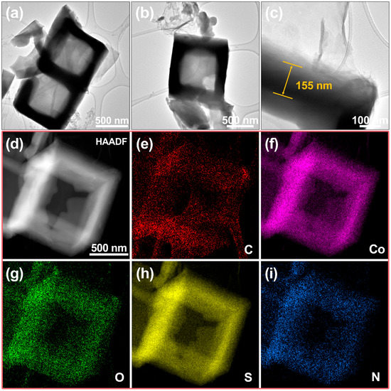 (a–c) TEM image of Co-MOF@rGO, (d) HRTEM images of EDX mapping of hollow Co-MOF@rGO flexible films, (e–i) are the elemental mapping of C, Co, O, S and N, respectively.