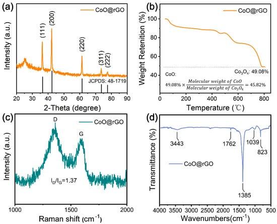 (a) XRD patterns; (b) TG curve; (c) Raman spectra; (d) FT-IR spectra of the CoO@rGO flexible film.
