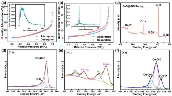 Nitrogen adsorption–desorption isotherms of (a) Co-MOF@rGO before etching and (b) Co-MOF@rGO after etching; (c) XPS survey spectrum and corresponding (d) C 1s, (e) Co 2p, and (f) O 1s XPS spectra of the CoO@rGO flexible film.