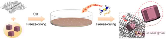 As shown in Scheme 1, the Co-MOF nanocubes (Figure S1) prepared in advance were co-dispersed with GO in deionized water and later freeze-dried to form a film directly. Then, using the strong reduction effect of (NH4)2S, GO was rapidly reduced to rGO, and the Co-MOF@rGO flexible film was obtained. It is noteworthy that Co-MOF is a tunable and unique porous backbone structure at the molecular level, and in addition, it can be etched by NH4+ to form a hollow structure. This is because ammonia will coordinate with cobalt cations to form complex ions, which cause the etching of cobalt [33]. Therefore, while the three-dimensional reduced graphene oxide network improves the electrical conductivity of the material, its hollow structure further shortens the ion transport path; thereby, the ion transport efficiency can be effectively improved. Meanwhile, the buffering effect of the 3D reduced graphene oxide network can effectively adapt to the volume change during the cycling process. Thus, it will be a promising new anode material for energy storage devices.