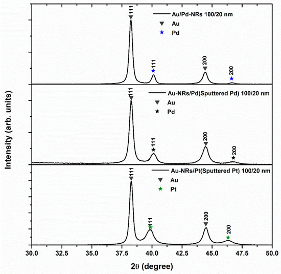 Subsequently, the supported Au-NRs were introduced into the sputtering chamber. Next, 20 nm thick Pt and Pd films were RF sputtered on the Au-NRs samples and the supporting substrate using pure targets (Pt and Pd (ESG Edelmetall GmbH, Rheinstetten, Germany)) under an approximate argon partial pressure of 10-3 mbar. The sputtering power was set to 100 W for Pt and 120 W for Pd (at room temperature). The film thickness was monitored by using a quartz crystal microbalance. The sputtering of the 20 nm Pt layer on a Silicon/Ti (2 nm)/Au substrate (the same substrate used to grow the Au-NRs) was introduced together with Au-NRs to the sputtering chamber.