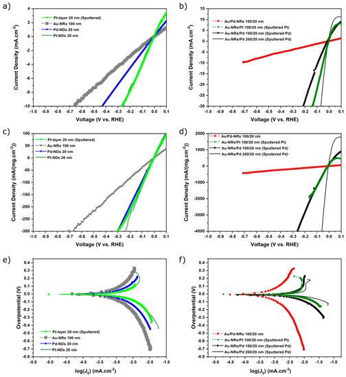 The slopes calculated at low overpotentials (in absolute value) are listed in Table 1. They range from values of 139 to 24 mV/dec, probably reflecting different structure-dependent HER mechanisms (see below for discussion). The Au-NRs show the highest slope (139 mV/dec), followed by the slopes of the electrodeposited Pd (96 mV/dec) and layered Au/Pd (94 mV/dec) nanostructures. The electrodeposited Pt-nanodiscs (53 mV/dec) and sputtered Pt layer (57 mV/dec) show intermediate values that are higher than what is known for carbon supported Pt-NPs [27] but lower than the values reported for polycrystalline Pt [28,29]. For the Au/sputtered Pt and Pd nanostructures, the values decrease to roughly 24 mV/dec for Au/Pt and 37 mV/dec for Au/Pd, although the lowest value is shown by Pd sputtered on the longer 200 nm Au-NRs.
