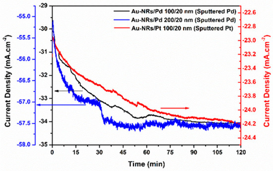 Chronoamperometric curves of Au-NRs/Pt 100/20 nm, Au-NRs/Pd 100/20 nm, and Au-NRs/Pd 200/20 nm in 0.5 M H2SO4 at −0.4 V for 120 min.