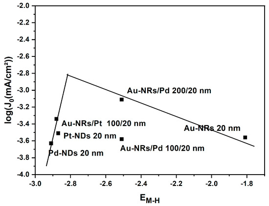 Figure 8 shows a tentative volcano plot of the hydrogen evolution reaction that relates the exchange current density to the calculated adsorption energies. As mentioned above, Pt is known to be located at the top of the volcano with the highest activity and a moderate adsorption energy, which is strong enough to activate the HER and prevent the formation of stable intermediates that suppress the HER. The mechanisms of HER for Pt and Pd are reported to obey the Volmer–Tafel mechanisms [38,39], although this has been questioned by Durst et al. [23]. Regarding our results and taking into account the Tafel slopes obtained as well as the calculated adsorption energies of H on Pt, Pd, AuPd, and AuPt, there is a trend towards a parallel Volmer–Heyrovsky mechanism with a fast Volmer step. The Au effect on Pd indicates that electronic interactions at the interface between Au and Pd lead to a suitable change in the adsorption energy of H on all Pd sites, and this translates in a fast Volmer–Heyrovsky mechanism. It can be further demonstrated that the interfacial interactions between Au and Pd play a paramount role in controlling performance of Au-NR/Pd 200/20 nm, where an increase in the interfacial area between Au and Pd results in higher activity (without change in the HER mechanism).