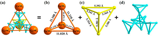 In the polyoxoanion 1, {[Co4(μ3-OH)3(PO4)]4(A-α-GeW9O34)4} can also be simplified by omitting sectional oxygen ions from {A-α-GeW9O34} (Figure 3a). Four CoⅡ in each {Co4(μ3-OH)3O14} can form a {Co4} tetrahedron. The four Cos at the vertex position of four identical {Co4} tetrahedrons and four μ4-O atoms of {PO4} linkers can construct a {Co4O4} cubane in the center of {[CoⅡ4(μ3-OH)3(PO4)]4(A-α-GeW9O34)4} (Figure 3b,c).