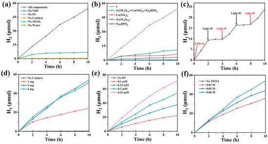 In addition, it is worth mentioning that the color of the reaction system rapidly changed from bright yellow to dark blue upon light irradiation, simultaneously coupling the linear hydrogen evolution with the irradiation time. In the meanwhile, catalyst 1 was also transformed into the heteropoly blue intermediates, indicating the reduction of 1 during photocatalysis, which is commonly observed in the literature reports [42,54]. When the reaction system was moved to a dark environment, hydrogen production stopped immediately. The same phenomenon appeared in the light ON-OFF experiments (Figure 5c). After exposure to air, the heteropoly blue intermediates will return to their original pink color. The rapid formation and disappearance of heteropoly blue intermediates show the strong and reversible multielectron storage abilities of POMs. As discussed in previous reports, heteropoly blue intermediates act as an active species by receiving multiple electrons in the vacant W 5d orbitals, which promote the hydrogen evolution process [42,54]. The catalytic activity is also related to the amount of catalyst used. When the catalyst dosage was 1, 3, and 6 mg, the hydrogen yield reached 24.07, 54.21, and 51.44 μmol in 10 h, corresponding to the hydrogen production rate of 2407.62, 1807.07, and 857.46 μmol·g−1·h−1, respectively (Figure 5d and Figure S7). In addition, the concentration of photosensitizers is also a significant factor to the enhancement of hydrogen production. When the concentration of [Ir(ppy)2(dtbbpy)][PF6] was changed from 0.10 to 0.25 mM, the hydrogen evolution exhibited linear growth with reaction time, yielding 11.04 to 71.84 μmol H2 after 10-h. The hydrogen evolution rates ranged from 924.47 to 2394.91 μmol·g−1·h−1 (Figure 5e). Moreover, because the experiments varied the concentration of TEOA from 0.03 to 0.06 M, the hydrogen production ranged from 35.72 to 54.21 μmol. The calculated hydrogen evolution rate ranged from 1190.69 to 1807.07 μmol·g−1·h−1 (Figure 5f). It is noted that varying the concentration of NHS from 0.075 mM to 0.300 mM barely changed the H2 yield, which maintained a constant concentration of TEOA (0.060 M) (Figure S8).