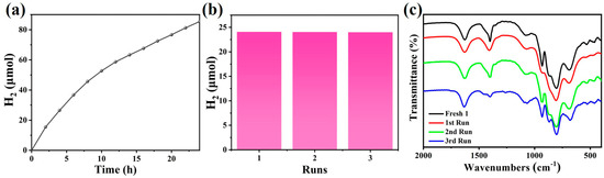 (a) Long term photocatalysis of water reduction reaction test; (b) Recyclability tests of 1 towards hydrogen generation in three cycles. (Reaction conditions: 10 W white LED light, 1 (1 mg), TEOA (0.060 M), NHS (0.153 mM), [Ir(ppy)2(dtbbpy)][PF6] (0.2 mM), H2O (2 M), CH3CN/DMF (1/3) as mixed solvent, the total reaction volume of 6 mL, stirring speed 400 rpm, at room temperature); (c) FT−IR spectra of fresh and the isolated 1 after the catalytic cycles.
