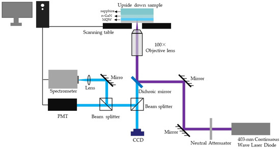 The blue LED epitaxial wafer was grown via metal-organic compound vapor deposition (MOCVD). The epitaxial structure consisted of a 2 µm thick GaN nucleation layer, along with a 2 µm think Si-doped n-GaN, 12 periods of InGaN/GaN MQWs and 240 nm thick Mg-doped p-GaN. micro-LED mesa arrays were fabricated to square mesas with a size of 20 × 20 µm2 by inductively coupled plasma (ICP) etching with the etching gas of Cl2/BCl3 (see Figure S1). Figure 1 shows the schematic of a scanning micro-photoluminescence measurement system. A continuous-wave (CW) laser diode (Power Technology, Alexander, AR, USA) with excitation wavelength 403 nm was used as the laser source. The laser was focused through a 100× lens with NA = 0.9 from Olympus Inc. The focused size of the laser spot was 900 nm and a neutral attenuator was used to control the energy density of the injected laser. The injected laser power density ranged from 5.8 × 103 to 7.6 × 106 W/cm2. A CCD was used to ensure the accuracy of the optical path of the test system. The PL signal was collected by the same objective lens and was directed to a photo multiplier tube (PMT) for PL mapping after passing through a 413 nm long-pass filter. The 413 nm long-pass filter was used to filter the laser reflected by the sample. A diffraction grating spectrometer (HORIBA-iHR550, Jobin Yvon, Kyoto, Japan) with an optical resolution of 0.02 nm was used to capture spectral signals from samples. A temperature control stage (THMS600, Linkam, Salfords, UK) was used to cool down the sample. An optical table with an air floating vibration isolation was used to install the whole installation. The sample was mounted on an xy-axis piezo nano displacement scanner with a resolution of 0.1 nm, which was a part of near-field optical microscopy (SNOM). SNOM (NTEGRA Solaris Probe NanoLaboratory produced by NT-MDT, Moscow, Russia) was used to study near-surface optical characteristics (including luminescent and spectral characteristics) of various objects with resolution much greater than the diffraction limit. The higher resolution was gained by exposing samples to light going through a diaphragm whose aperture was much less than the wavelength of the radiation detected. The surface under study lies in the near field of the diaphragm (at distances of about 10 nm).