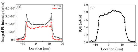 (a) Integral PL intensity under laser power density of 7.6 × 106 W/cm2 as a function of position at 77 K and 300 K. (b) The IQE extracted from Figure 2a.