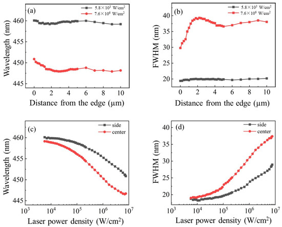 (a) The wavelength at the side and the center as a function of excitation laser power density, (b) FWHM at the side and the center as a function of excitation laser power density. (c) FWHM as a function of distance from the edge under 5.8 × 103 W/cm2 and 7.6 × 106 W/cm2, (d) corresponding peak wavelength as a function of distance from the edge.