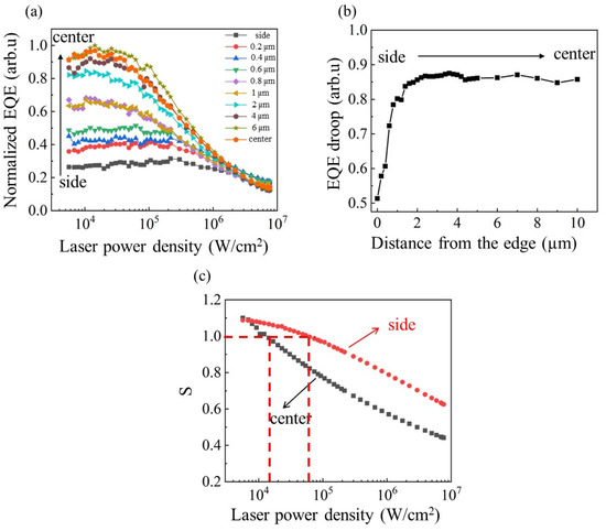 The S factor will converge to a value smaller than one; if the Auger recombination is a dominant carrier loss mechanism, an S factor of one is related to the radiative recombination. Meanwhile, an S factor bigger than one is mainly caused by the non-radiative recombination by defects [37]. It can be observed in Figure 5c that the S factor is decreasing with excitation power increasing at the side and center, and the S factor falls faster at the center. The level of defect saturation increased along with a higher injection of laser power density at steady-state injection [40]. There was a higher power density at S = 1 near the sidewall, implying a higher defect density at the sidewall. When the laser power density was higher than 5 × 104 W/cm2, the S factor at the sidewall was bigger than the center ones, indicating that the Auger recombination was more remarkable at the center and, thus, a bigger EQE droop occurred at the center.