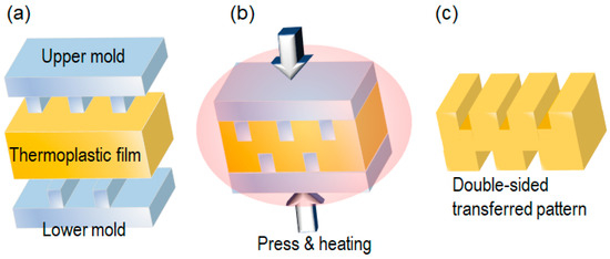 In the double-sided process, the substrate is replaced by another mold, as shown in Figure 2. In this process, although the thermoplastic film should provide enough thickness for handling, the transferred patterns are obtained on both sides of the film []. Only the surface of the film can be heated to or near its Tg. Heating the entire film above or close to Tg would cause deformation or stretching. The double-sided patterned film is particularly valuable for optical applications. This process can also be applied to thermosetting plastics.