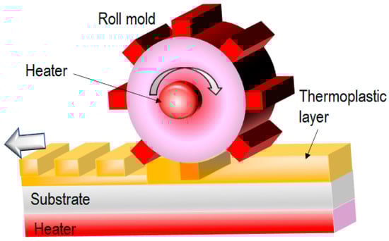 Obtaining planar NIL molds using a conventional lithography process with EBL or photolithography is easy. However, these molds are typically made of silicon wafers or quartz, which are hard materials. A roller T-NIL process using a roll mold [] is suitable for overcoming the bottleneck of the heating and cooling times in T-NIL processes (Figure 4). Because the roll mold is difficult to fabricate, a replica mold made by nickel electroplating is widely used for roller T-NIL. Here, nickel foil, used for its flexibility, is attached to a roll substrate, and the nickel replica mold has sufficient temperature durability for the T-NIL process. Therefore, the mold pattern can be transferred to the thermoplastic layer coated on a planar substrate, eliminating the need for prolonged heating and cooling. The transferred thermoplastic layer can be fabricated by spin-coating, allowing for sub-µm layer thickness, which can be easily removed by etching after the lift-off process. In this case, tension control for web feeding is not necessary. A softer backing roll helps to increase the contact time between the roll mold and the thermoplastic layer. However, precise temperature, speed, and pressure control are necessary because cooling is achieved naturally and without cooling equipment. In some instances, the pattern can be achieved through the plastic deformation of the thermoplastic layer.
