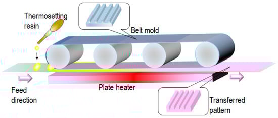 To further improve the throughput and transferred pattern quality, belt-type T-NIL processes have been proposed [,]. These processes require a belt-type flexible mold. A replica mold is widely used for this purpose. Figure 5 shows the schematics of the belt-type T-NIL process using a thermosetting resin such as polydimethylsiloxane (PDMS). A plate heater is used to cure the thermosetting resin. The heater does not require contact with the base film because the tension of the base film facilitates the contact force between the belt mold and the base film. For example, when PDMS is used for thermosetting resin, the curing time is 2–3 min at 130 °C. In this case, a flexible polyurethane acrylate mold is used.