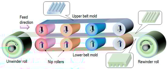 Figure 6 shows the schematics of the belt-type T-NIL process using a thermoplastic film. In this process, the cooling process is crucial to improve the throughput. If the imprinted pattern is released from the mold at a temperature above Tg, the pattern collapses immediately. Thus, cooling rollers or additional cooling equipment are essential for high throughput. In Ogino, et al., dots with a diameter of 200 nm and a height of 240 nm were formed on a 15-meter-long polystyrene sheet within 27 min [].