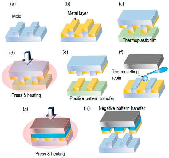 The above T-NIL processes focus on the fabrication of plastic or resin patterns. However, some sensors, such as SERS sensors, require metal nanopatterns on a plastic substrate. Nanotransfer printing (nTP) [] is a promising technology for fabricating metal patterns on plastic substrates. The original nTP process is shown in Figure 8a–e. First, a mold is coated with a transferred metal. Next, the coated mold and a plastic substrate are pressed against each other under heating. The plastic substrate is not deformed by the pressure, and only the metal layer on top of the mold is in contact with the plastic substrate. Using the difference in surface tension, the top metal layer is transferred to the plastic substrate. When the mold is pressed against the plastic substrate at high pressure, all metal layers are transferred.