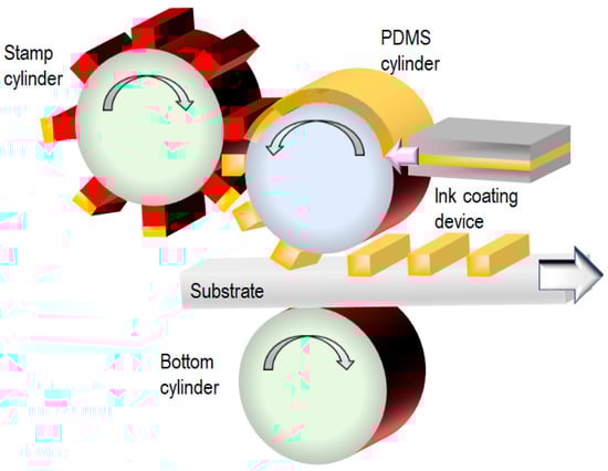 nTP typically uses a metal layer deposited by physical vapor deposition, which requires a long time to prepare a vacuum condition. As a result, obtaining the metal layer on a large area is difficult. By contrast, reverse offset (RO) technology [] provides high throughput and high resolution (1 µm) using conductive nanoparticle inks (Figure 9). Furthermore, a roll-to-roll process for RO has been achieved. In this method, control of the surface energy is crucial for the ink pattern transfer.