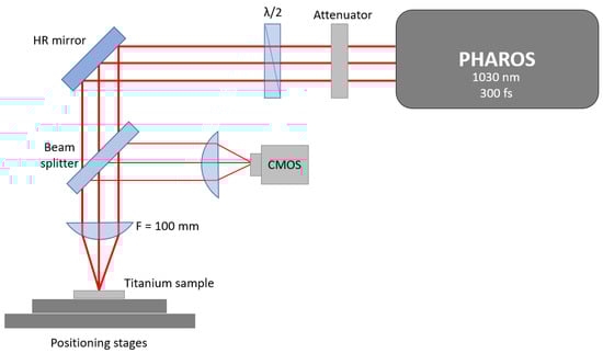 Scheme of the experimental laser setup used for irradiation of titanium plate samples for the formation of LIPSS: CMOS—optical camera; HR—high reflection mirror.