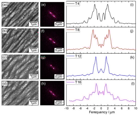 Graphical representation of the LIPSS periodicity measurements procedure: FESEM images of fs laser irradiated titanium plate surfaces with hatch spacings of 4 (a), 8 (b), 12 (c), and 16 (d) µm with corresponding 2D-FFT images (e–h) of the SEM image and profile (i–l) from 2D-FFT images with peaks representing spatial frequencies.