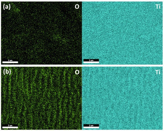EDS mapping (Figure 3) shows that after irradiation with a fs laser, the oxygen concentration on the surface of titanium increases in comparison with nonirradiated samples, where traces of native oxide [] can be observed (Figure 3a). It can also be observed that oxygen is mainly distributed on the top surface of LIPSS.