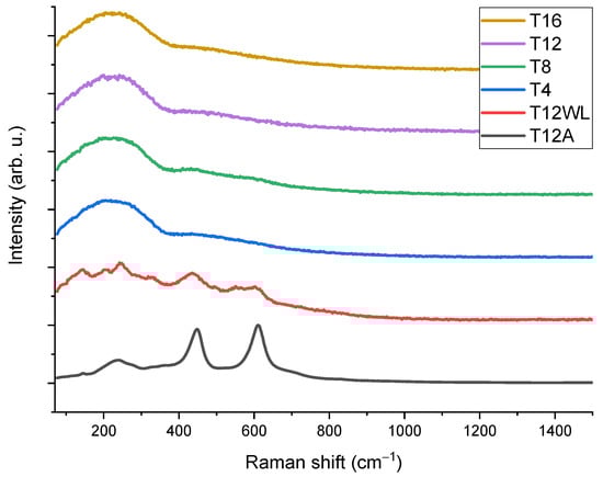 We employed reference data on their frequencies in single crystals to identify titanium oxide-related modes on Raman spectra after laser processing []. Nevertheless, analyzing the Raman spectra of amorphous or polycrystalline layers can be challenging due to peak shifting and broadening compared to those observed in single crystals. These alterations in peak characteristics are primarily attributed to the presence of grain boundaries, extended defects, and stresses. The Raman spectra (Figure 5) of samples T4, T8, T12, and T16 with different hatch spacing show amorphous semiconductor phase formation with a broad peak around 250 cm−1 []. Alternately, it could be attributed to the formation of nanocrystallites on the surface of LIPSS. Additionally, in two cases, the influence of the utilization of variant laser parameters in the case of a hatch spacing of 12 µm was investigated. For this purpose, we used a higher laser fluence of 106 mJ/cm2 for T12WL samples (where WL stands for without LIPSS) and 254 mg./cm2 for T12A samples (where A stands for ablation). While T12WL remains in a transitional state between the amorphous and crystalline phases, the sample surface of T12A corresponds to the formation of the TiO2 rutile phase [].
