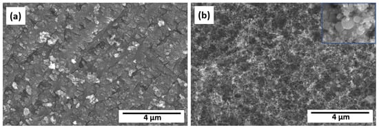 From FESEM images (Figure 6), it can be seen that sample T12WL can be characterized by nonregular surface structures, while in the case of T12A, ablation of TiO2 nanoparticles (rutile phase) takes place. The morphology of nanoparticles exhibits a diverse size distribution, with the nanoparticles typically being less than 70 nm in diameter, while Figure 6b inset provides visual evidence that these nanoparticles tend to have a round shape. The antimicrobial properties of such structures were not tested due to the absence of LIPSS in the case of T12WL, as well as the formation of nanoparticles via the ablation process in the case of T12A, which has weak adhesion to the titanium plate surface. The size distribution observed in the morphology of nanoparticles makes it an intriguing case for developing a method for metallic or semiconductor nanoparticle production with various sizes from metals using laser [].