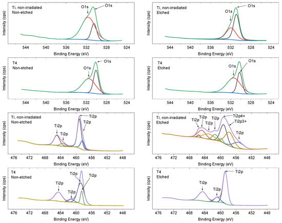 For chemical bond detection and surface atomic concentration analysis, XPS high-resolution core level spectra were scanned for Ti and O in non-irradiated and irradiated areas (Figure 7). The O1s peak at 531 eV can be attributed to OH group formation or defective oxides []. After surface etching using an Ar ion gun with mild etching conditions, lesser titanium oxides and titanium metal can be detected. Peak splitting between Ti (IV) 2p3/2 and 2p1/2 peaks cannot be attributed to rutile or anatase phase due to low signal strength. The peak-value standard deviation is 0.05 eV. The deviation for elemental atomic concentration is associated with 0.5%.