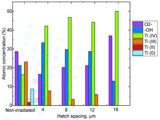 Surface modification with the fs laser favors the formation of Ti (IV) oxides, according to the peak fitting results (Figure 8).