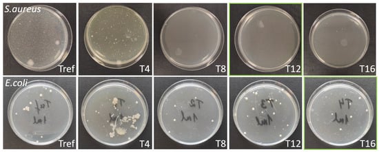 The stability performance of the phage in the presence of Tref and T16 titanium plates was evaluated by executing the plaque assay at the aforementioned multiple incubation points in time—0 h, 6 h, 12 h, 24 h, and 36 h, respectively.