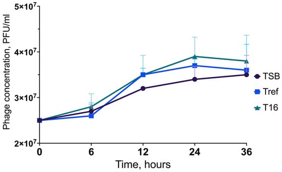 The phage stability was maintained at all time points (0 h, 6 h, 12 h, 24 h, and 36 h) assessed by plaque assay; no log loss in the phage titer was observed (see Figure 11 and Figure 12). Furthermore, all experiment samples, namely, phage-only suspensions in TSB, Tref, and T16 after incubation for 36 h, exhibited slightly increased viral titers: 3.5 × 107 PFU/mL, 3.6 × 107 PFU/mL, and 3.8 × 107 PFU/mL, respectively. In addition, the viral titer rose more rapidly in all experiment samples after 12 h of incubation.
