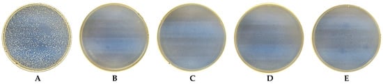 Visual plaque assay results of Escherichia coli bacteriophage T4 (ATCC 11303-B4) over a 36 h period. (A) Plaques of a 104 dilution of an original phage stock at 0 h. (B) Plaques of a 104 dilution of a phage stock when exposed to a T16 titanium plate for 6 h, (C) 12 h, (D) 24 h, and (E) 36 h. The diameter of the Petri dishes is 85 mm.