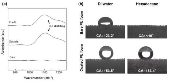 (a) C−F stretching region from the FTIR spectra of the inside and outside regions of the FSCSNs-coated PU foam and the bare PU foam. (b) Static contact angle (CA) measurement results for bare PU foam and FSCSNs-coated PU foam.