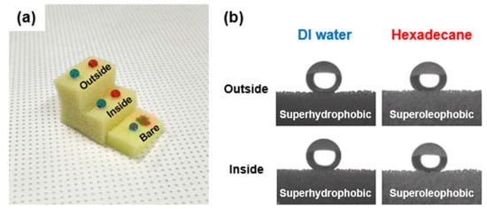 Furthermore, an experiment was conducted to confirm whether both the inside and outside of the coated PU foam had omniphobic properties. Figure 3a shows photographs taken after dropping DI water (blue) and hexadecane (red) on the bare and coated PU foam samples to examine the liquid repellency of the inside and outside of the PU foam. As a result, the liquid dropped on the bare PU foam permeated inside, whereas the liquid dropped on the FSCSNs-coated PU foam maintained its spherical shape. Figure 3b shows the results of measuring the static contact angles of the inside and outside of the coated PU foam. The results confirmed that the contact angle of both the inside and outside of the coated PU foam was 150° or more, indicating that it had omniphobic properties.
