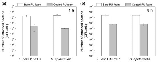 The bacterial adhesion behavior on the bare PU foam and the PU foam coated with FSCSNs over time was confirmed using the pour plate method. The plate counting results of the PU foam samples inoculated with (exposed to) the bacterial suspension for 1 h and 8 h are quantitatively represented graphically in Figure 5. First, the results of inoculation for 1 h, as shown in the left graph of Figure 5a, indicate that the mean population of bacteria adhered to the PU foam inoculated for 1 h in E. coli O157:H7 suspension was 7.3 log CFU/mL for the bare PU foam and 4.5 log CFU/mL for the PU foam coated with FSCSNs. In addition, in the results of inoculation with S. epidermidis shown in the right graph, the mean population of bacteria adhered to the PU foam was 7.4 log CFU/mL for the bare PU foam and 5.0 log CFU/mL for the PU foam coated with FSCSNs. In other words, as a result of immersion in the bacterial suspension for 1 h, the bacteria adhering to the coated PU foam surface were reduced by 98.9%. The trend of the 1 h adhesion test results was similar for the 8 h test. As shown in Figure 5b, the mean population of bacteria adhered to the PU foam inoculated for 8 h in E. coli O157:H7 suspension was 7.4 log CFU/mL for the bare PU foam and 5.8 log CFU/mL for the coated PU foam. In addition, as a result of inoculation with S. epidermidis, the mean population of bacteria adhered to the PU foam was 7.5 log CFU/mL for the bare PU foam and 5.7 log CFU/mL for the PU foam coated with FSCSNs. Similar to the results of inoculation for 1 h, the PU foam coated with FSCSNs showed a 97.4% decrease in the degree of adhesion after 8 h of bacterial exposure compared to the bare PU foam. This confirms the antimicrobial properties of the PU foam coated with FSCSNs; the results of the pour plate method indicated an average of a 1–2 log units decrease compared to the bare PU foam. The PU foam coated with FSCSNs could prevent the proliferation of bacteria even during the proper sleeping time (i.e., 8 h), when the body is in contact with the mattress for a long time.