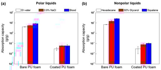 Absorption capacity of bare and FSCSNs-coated PU foams for (a) polar liquids (DI water, 0.9% NaCl, and blood) and (b) nonpolar liquids (hexadecane, 50% glycerol, and squalene).