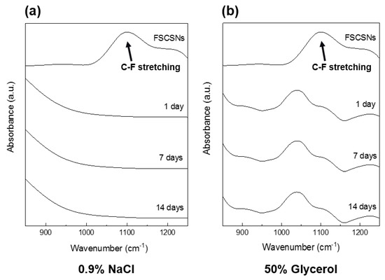FTIR spectra of aliquots collected from samples of the FSCSNs-coated foam that had been immersed for up to 14 d in (a) 0.9% NaCl and (b) 50% glycerol, showing the absence of C−F stretching.