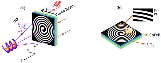Figure 1a shows a schematic of an STE-HFZP based on the detour phase technique, and it has a helical cantilever. Under the pump of a femtosecond laser pulse, a focused TVB with a TC of l = 1 is generated, and the inset shows the wave front of the TVB. The THz signal has a peak when the thickness of the NM and FM layers is around 4 nm, respectively [15,21]; thus, the thicknesses of the NM and FM layers are selected as 4 nm, respectively. Figure 1b shows the detail of the STE-HFZP, where an FM layer (CoFeB) with a thickness of 4 nm is deposited on a SiO2 substrate [15]. Then, two helical NM layers (W and Pt) with the same thickness of 4 nm are deposited on the CoFeB film, and they are adjacently arranged. Here, we select W and Pt as the NM layer, because they almost have the same magnitude of γ, but their signs are opposite [26].
