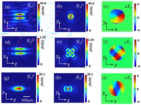 Calculated field intensities of the three electric components in the y = 0 mm plane (a,d,g) and the designed focal plane (z = 1 mm) (b,e,h). (c,f,i) show the phase profiles of the three electric components in the z = 1 mm plane.