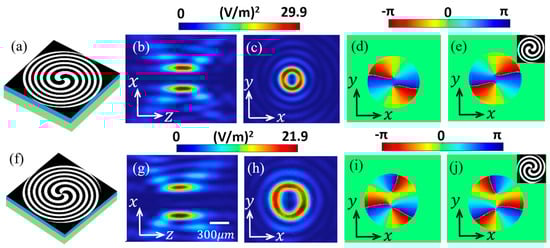 When l = 3 is selected in Equation (1), a focused TVB with a TC of l = 3 can be obtained. Figure 4f shows the STE-HFZP with l = 3, and it has three helical cantilevers. The generated THz beam is focused as shown in Figure 4g,h and Figure A3 in Appendix A. We find that the x component has a helical phase term of ei3φ, corresponding to a TC of l = 3 as shown in Figure 4i. Figure 4g,h shows the distribution of Ex in the y = 0 mm plane and the z = 1 mm plane, respectively. Compared with Figure 4c, the radius of the ring is further enlarged. More importantly, Ex is also larger than the other two components, which do not have a well-defined OAM. When the helical direction of the three helical cantilevers of the STE-HFZP is reversed, as shown in the inset in Figure 4j, a focused TVB with a TC of l = −3 is generated, as shown in the phase profile in Figure 4j. We should point out that the field intensities of the three components are the same as the STE-HFZP with l = 3, and they are neglected. Similarly, the phase profiles of the other two components are opposite to l = 3, as shown in Figure A3 in Appendix A. To generate TVBs with higher TCs and change the focus of the target frequency, we only need to change the pattern of the STE-HFZP according to Equation (1).