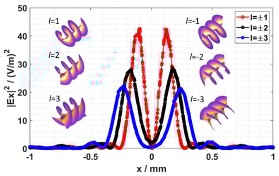 We have seen that with the increase in the TC, the radius of |Ex| increases. To quantitatively analyze the radius of the ring, the line scans of the center of |Ex| in the z = 1 mm plane are plotted and shown in Figure 5. The insets show the helical wave front of the focused Ex with TCs of l = ±1, ±2 and ±3, respectively. These TVBs all have donut shapes, while their phases are opposite. It is clearly shown that the radii of the three rings are about 123 μm, 175 μm and 243 μm, respectively. This phenomenon is in good agreement with the property of a conventional vortex beam, where the ring size has a strong dependence on the TC [31].
