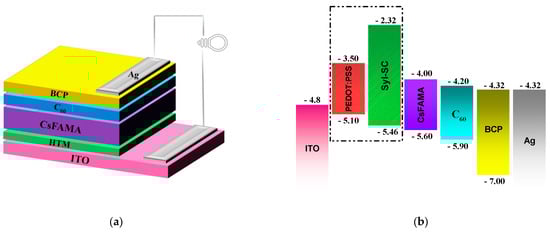 The structure of the inverted planar PSCs (iPSCs) was ITO/HTM (PEDOT:PSS or Syl-SC)/CsFAMA/C60/BCP/Ag, as illustrated in Figure 1a. Prepatterned ITO glass substrates were sequentially cleaned with Mucasol solution (2% in deionized water), DI water, ethanol, and IPA in an ultrasonic bath for 10 min each. Firstly, 60 µL HTM (PEDOT:PSS or Syl-SC) solution was spin-coated onto the clean ITO substrate and annealed, then the ITOs were cooled down to room temperature and transferred into a N2-atmosphere glovebox. Next, the deposition of the triple-cation perovskite layer was achieved in a N2 glovebox by spin-coating onto the HTM film in a static antisolvent-assisted two-step procedure at 1000 rpm for 10 s, and 4000 rpm for 25 s, followed by the addition of 110 µL on the spinning substrate during the last 12 s for the antisolvent step. After that, the samples were annealed for 40 min at 100 °C. Afterwards, 20 nm of C60 and 8 nm of bathocuprine (BCP) were thermally evaporated successively on top of the perovskite layer as electron-selective layers. Lastly, a 100 nm Ag layer was deposited at low pressure (10−6 bar) to complete the device. The active area of all devices is 0.09 cm2.