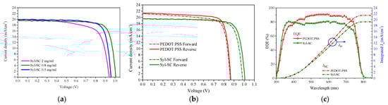 The J–V curves of devices made with Syl-SC and PEDOT:PSS showed a low hysteresis effect; however, in devices with Syl-SC, the hysteresis reduced the FF and Voc, while in PEDOT-PSS-based devices, the hysteresis had a major effect on the FF. The hysteresis index (HI), HI = (PCEreverse − PCEforward)/(PCEreverse) [63], was calculated to quantify the discrepancy between the two scanned efficiencies. The best Syl-SC device (0.8 mg/mL) shows the lowest hysteresis index in comparison with both PEDOT:PSS and spiro-based reference devices. The champion device based on Syl-SC exhibited the highest PCE of 15.77% (reverse scan), with a Jsc of 20.00 mA/cm2, a Voc of 1.006 V, and an FF of 80.10%. On the other hand, the champion device based on PEDOT:PSS exhibited a PCE of 14.76% (reverse scan), with a Jsc of 21.37 mA/cm2, a Voc of 0.866V, and an FF of 79.70%, values that are higher than the references made with doped and undoped spiro in our previous work [45]. Thus, we have continued our work, taking as a sole reference the device made with PEDOT:PSS. The higher PCE of the iPSC with Syl-SC (0.8 mg/mL) can be mainly attributed to its higher Voc compared to the device with PEDOT:PSS (1.006 and 0.866 V, respectively). However, the iPSC with PEDOT:PSS exhibits a higher Jsc than that of the Syl-SC-based device (21.37 and 19.57 mA/cm2, respectively). To validate the Jsc calculated from J–V curves, external quantum efficiency (EQE) measurements were performed on devices with Syl-SC and PEDOT:PSS. Figure 2c displays the EQE spectra and the integrated Jsc of the PSCs. The integrated Jsc, calculated from the EQE, is 21.45 mA/cm2 for PEDOT:PSS and 19.25 mA/cm2 for Syl-SC, which fits with the current density extracted from the J–V curve.
