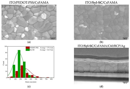 Top view surface FESEM images of (a) PEDOT:PSS; (b) Syl-SC (0.8 mg/mL); (c) CsFAMA grain size distribution on PEDOT:PSS (red)/Syl-SC (green) calculated from 150 grains from FESEM images; (d) cross-sectional FESEM image of the p-i-n device with Syl-SC as the HTM.