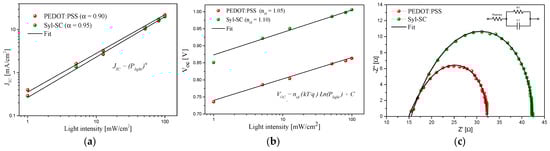 (a) Dependence of Jsc on the light intensity. The experimental data (symbols) are fitted (solid lines) using ; (b) dependence of Voc on the light intensity. The experimental data (symbols) are fitted (solid lines) using ; (c) impedance spectroscopy Nyquist plot for iPSCs with PEDOT:PSS and Syl-SC measured under 1 Sun illumination at 0.75 V bias. The inset shows the equivalent circuit model used to fit (solid lines) the experimental data (symbols).