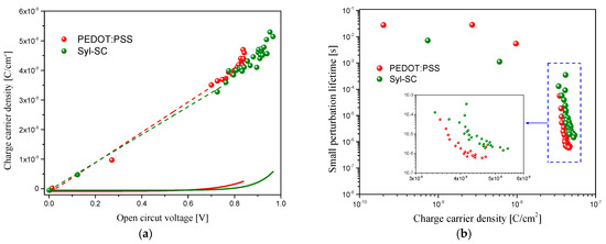 To obtain further insight into the effects of Syl-SC on the charge recombination dynamics, we carried out charge extraction (CE) and transient photovoltage (TPV) measurements under standard device PV operating conditions in terms of light intensity and applied voltage [70], which is important for PSCs that display light intensity-dependent properties [71,72,73]. As a large modulation transient method, CE is a measurement that allows extraction of all the charges present in the solar cell once the Voc of the device is stabilized, and while the illumination is switched off. After a short circuit of the solar cell, the resultant transient discharging current is measured through a small external load resistor. Figure 5a shows the charge extraction of the device obtained applying different open circuit voltages under illumination. The charge density exhibited two different regimes, linear and exponential. The linear trend in the voltage region 0–0.8 V is attributed to accumulated charge at the electrodes (geometrical capacitance). On the other hand, after 0.8 V, the charge carrier density exhibited an exponential dependency on the applied voltage, and is related to the accumulated charge at the HTM/perovskite/ETM interfaces (chemical capacitance). The charge density within the bulk of the device is estimated by subtracting the geometrical capacitance from the CE data. The charge density at the bulk (solid lines in Figure 5a) shows a more pronounced slope at 0.7–0.85 V for the PEDOT:PSS, and at 1 V for Syl-SC. The better energy alignment between the HOMO of the Syl-SC and the perovskite valence band (VB) would be the reason for these differences in the charge vs. voltage. As previously reported [74], the resulting Voc arises from the respective HOMO energy level [75], as well as the disorder of the density of states and the recombination constant [72,76]. So thus, we analyse the interfacial carrier losses using TPV measurements in the different solar cell devices. Figure S8 (Supporting Information) shows the variation of the carrier lifetime () as a function of the Voc. To analyse the recombination kinetics more effectively, we compare the carrier lifetime (extracted from the TPV plot) as a function of charge density (extracted from the CE plot), as shown in Figure 5b. Thus, we compare the differences in carrier lifetime under a determinate charge value (vertical solid line at 4 × 10−8 C/cm2), as shown in the inset of Figure 5b. The recombination in the devices with PEDOT:PSS is one order of magnitude faster than that of devices with Syl-SC, which explains the differences in Voc values. Thus, Syl-SC can better reduce the charge recombination than that PEDOT:PSS. This result agrees with those obtained from light intensity-dependence of Voc and Jsc, and impedance spectroscopy analyses.