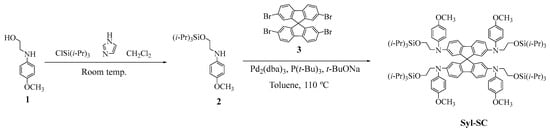 Herein, in this work we present the design and synthesis of a novel spiro-type HTM (Syl-SC) by replacing one of the methoxyphenyl groups by ethoxytriisopropylsilane for each N atom, as shown in Scheme 1. We have investigated the effects of the Syl-SC on the performance of p-i-n type PSCs based on CsFAMA triple-cation perovskite (Table 1). Reference cells were prepared using PEDOT:PSS and doped and undoped Spiro-OMeTAD (N2,N2,N2′,N2′,N7,N7,N7′,N7′-octakis(4-methoxyphenyl)-9,9′-spirobi[9H-fluorene]-2,2′,7,7′-tetramine) [45]. The incorporation of the triisopropylsilylether group improves the compound solubility [46], giving rise to uniform, hydrophobic, and high transmittance films, which can be easily deposited by spin-coating under environmental conditions.